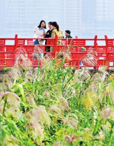 近日,汉口江滩风帆广场的芦荻已经陆续开花,成为市民赏秋的好去处。