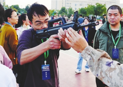 活动主办方还设置了轻武器装备展示体验区,把自动步枪、手枪、机枪、狙击枪等枪支摆放在展台上。观众可在工作人员指导下,拿起这些枪支实际操作。