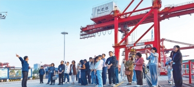 “城市观察团”探访阳逻港集装箱码头。