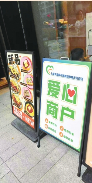 除了食堂,街边不少“爱心商户”也加入进来。在江汉区双玺中心一楼,便利店、咖啡店等商铺门外张贴着标识,提供免费饮水、充电、应急药品和临时休息等服务,部分商户还推出骑手专属优惠。