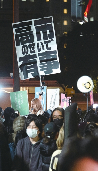 集会定于当地时间20时开始。19时前后,便有民众陆续赶到现场。抗议者们举着写有“撤回言论 反对战争”“因高市才有事”“高市下台”等标语的牌子,高喊“禁止军国主义复燃”等口号。多名抗议者要求高市对其涉台言论负责并辞去首相职务。