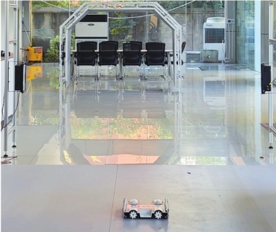 地面上看上去像玩具赛车的就是底盘检测机器人。