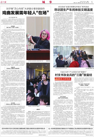 2018年,刘子微为青年演员排演《光之谷》,将目光投向武汉光谷的青年创业群体,在京剧唱腔中巧妙融入音乐剧、现代舞,也把挤地铁、项目路演等现代生活场景呈现于舞台上,拉近了与年轻观众的距离。
