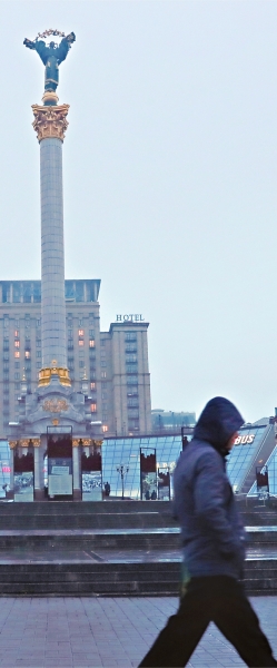 11月20日,乌克兰首都基辅主要街道的照明设施出现大面积停电,行人在暮色中走过独立广场。