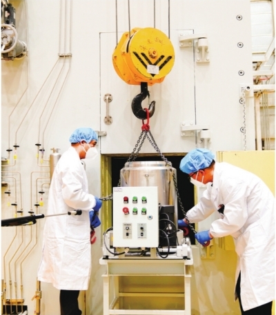 10月24日,在中国科学院上海应用物理研究所武威园区,科研人员在实验堆加料—取样接口区,从堆内取出燃料盐样品。