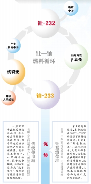 能否换一个思路?诺贝尔物理学奖得主卡罗·卢比亚曾说,钍资源可以保证中国2万年的电力需求。我国的钍资源储量居世界前列,钍-232吸收中子后经过两次β衰变生成铀-233,核裂变释放出大量能量,并产生新的中子,构成一个可持续的“钍—铀燃料循环”。这种循环的最大优势在于,能让我国储量丰富但“不活跃”的钍,高效转化为可用的核燃料,且产生的核废料更少。熔盐堆输出温度为650℃—700℃,热电转换效率高达40%—60%。