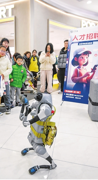 在金银潭永旺梦乐城举行的一场招聘会上,科技公司工作人员操作机器狗“求才”。