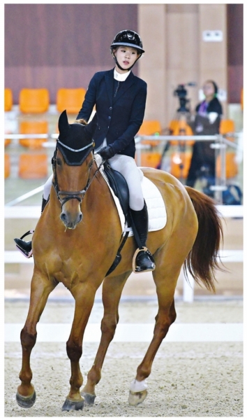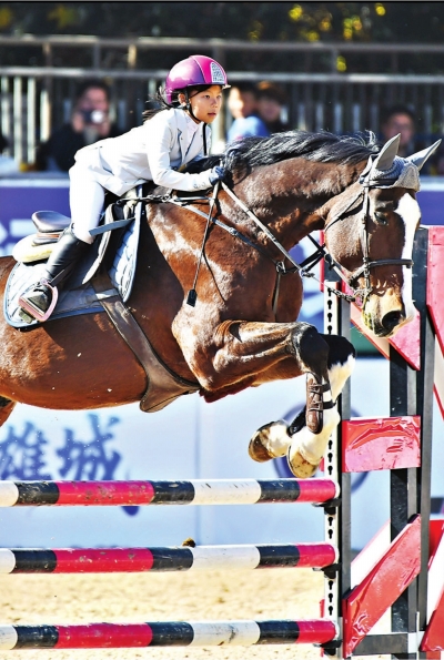在场地障碍赛80CM级别个人赛中,来自北京的9岁小姑娘萨沐格获得金牌。“我练习马术有两三年时间了,最初是爸爸带着我骑着一匹小马玩,后来我自己也爱上了这个运动。”萨沐格说。“马术最吸引我的地方就是不断挑战新的高度,然后在顺利完成全部比赛后会非常开心,有很大的成就感。”