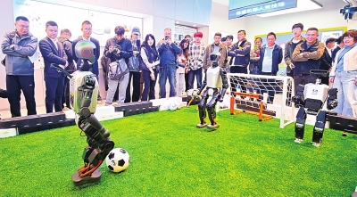 全国首家人形机器人7S店内,足球机器人对抗赛引来围观。