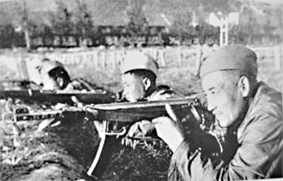1958年,张才千(右一)参加射击训练。