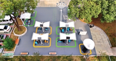联投花山郡三期社区体育中心(广场)于9月底向居民开放,场内有智能有氧健身器材及儿童游乐设施,包含智能漫步机、智能健身车、智能骑马机、智能扭腰器、智能推举训练器、智能划船器、儿童滑梯等器材,这些器材采用“太阳能+风力发电”相结合的供电模式运行,解决了社区居民“一老一小”的日常健身需求。