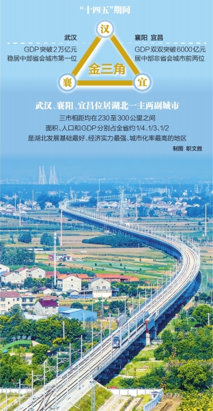 “十四五”期间,武汉经济总量突破2万亿元,稳居中部省会城市第一位,带动武汉都市圈经济总量突破3.6万亿元。襄阳、宜昌经济总量双双突破6000亿元,居中部非省会城市前两位,带动“襄十随神”“宜荆荆恩”城市群发展成势见效。武汉、襄阳、宜昌一小时高铁圈年底贯通,汉襄宜“金三角”协同发展格局加快形成。