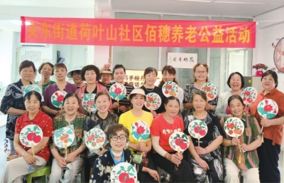 荷叶山社区养老公益活动上,居民们拿着自己绘制的团扇,开心地合影留念。