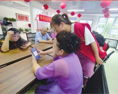 志愿者教老同志使用智能手机办理业务。