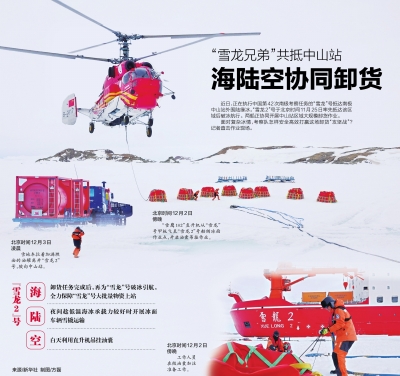 目前,“雪龙”号仍在中山站外围陆缘冰区域开展作业准备工作。考察队决定“雪龙2”号首先开展直升机吊挂与海冰运输作业,待其卸货任务完成后,再由“雪龙2”号为“雪龙”号破冰引航,全力保障“雪龙”号大批量物资上站。整个作业周期预计持续约15天。