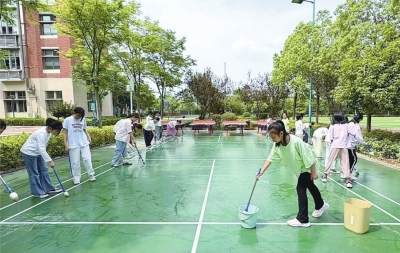 为了让书法融入日常,学校把学习空间“搬”到了各个角落:墨韵工作坊里,学生们用数字化工具设计书法文创;墨慧云端书院让放学后的孩子能继续和老师“云端论字”;就连操场也成了书法课堂,课间的“地书课堂”上,孩子们握着巨型毛笔在水迹中挥毫,笑声与墨香交织。学校设计的“智慧午练+社团+项目学习”,让不同基础的孩子都能找到乐趣——喜欢创作的加入书法社团,擅长临摹的参与碑帖研究项目,书法成了校园里的流行元素。