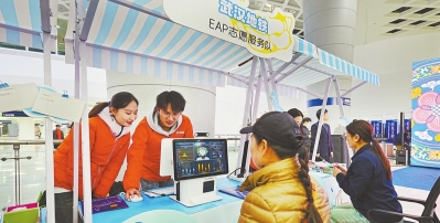 地铁“E心关爱”志愿者利用AI非接触式心理检测器为乘客进行心理健康测评。
