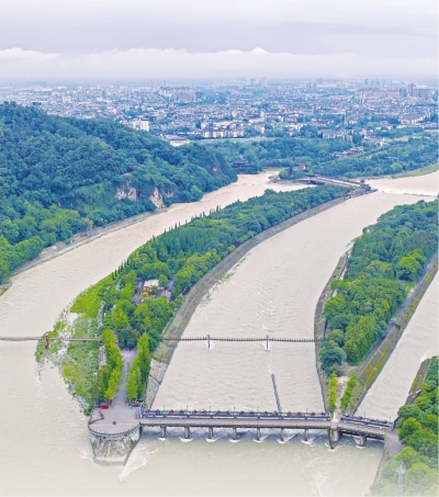 “鱼嘴分水堤”“飞沙堰溢洪道”“宝瓶口进水口”——都江堰的三大主体工程相互承接、浑然一体,既可以引水灌溉,又可以分洪减灾、排沙防淤。“乘势利导、因时制宜”的设计哲学,体现着古人先进的治水理念,承载着代代相传的守护精神,蕴含着人与自然和谐共生的中国智慧。