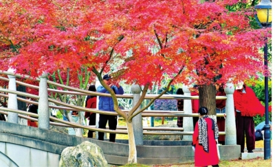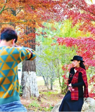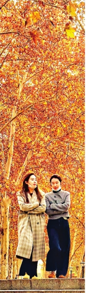 解放公园金黄的梧桐树叶特别亮眼,两位姑娘在石阶上漫步。