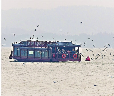 从西伯利亚来武汉越冬的红嘴鸥来到东湖。游客搭乘东湖游船往返楚风园与磨山,可以享受到红嘴鸥伴飞的乐趣。