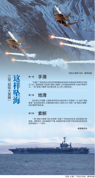 据报告描述,当时任务过于频繁,以致航母甲板无法保证每10天清理一次,因而“更脏更滑”;航母急转弯时,未通知操作战机入库的士兵,导致这架飞机滑落甲板坠海。报告说,无法判定相关制动系统为何没起作用,但建议取消上述士兵的操作资格。