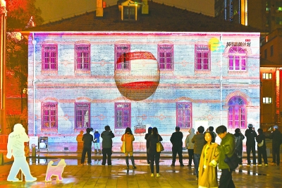 “武汉·有艺思”主题光影秀在江岸平和坊广场上演,吸引众多市民游客驻足。