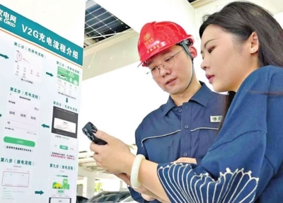 在南太子湖超级充换电站,供电人员指导车主向电网反向送电。