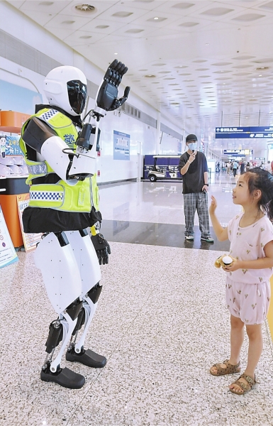 荆楚2号人形机器人演示交通指挥手势,向过往的旅客和学生宣传交通安全知识。