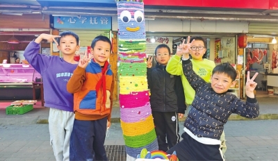 同学们为校园附近的街道树木“换装”。