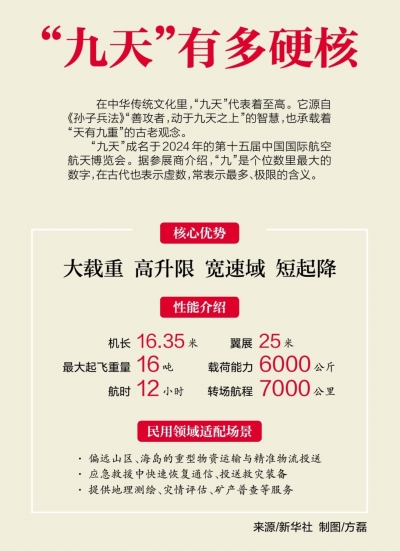 可能有人会问,现在无人机这么多,“九天”首飞到底有啥特别的意义?往小了说,它填补了我国军民两用重型无人机的空白;往大了说,它不管是对国防安全,还是对民用应急、经济发展,都有实实在在的影响。