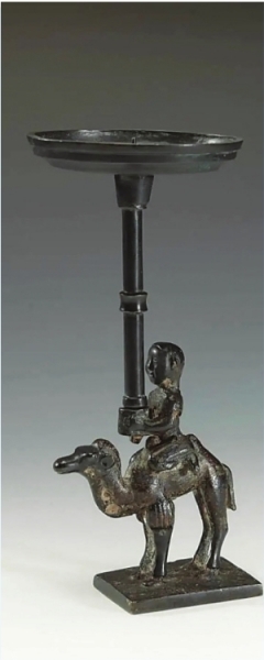 而在纪南城周边的楚墓中,则发掘出3件“人骑骆驼灯”,底座为长方形,其上矗立着一头双峰骆驼。骆驼背上骑坐一人,铜人双腿蜷曲,胸部挺直,双手合掌抱住一根立柱,立柱顶部承托着一个灯盘。铜人的脸型具有北方游牧民族的人种特征,骆驼更是生活在北方沙漠边缘的动物。人骑骆驼铜灯在南方楚国出现,说明在2000多年前,楚人与北方游牧民族之间有着频繁的人员交往和经济往来。这件文物是楚文化与西域文化交流的重要物证。