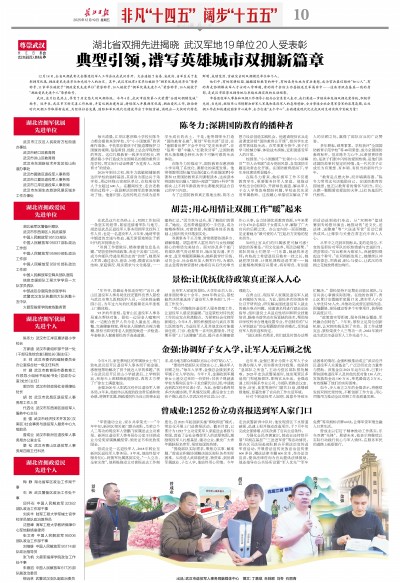 武汉,这片红色热土,孕育了历史悠久的双拥传统。今年4月,武汉市连续第八次荣膺“全国双拥模范城”称号。近年来,武汉市不断完善工作机制,丰富双拥共建内涵,持续深入开展拥军优属、拥政爱民工作,推动新时代双拥工作取得新成效,为经济社会发展、国防和军队现代化建设作出了积极贡献,涌现出一大批时代特色鲜明、成绩斐然、贡献突出的双拥模范单位和个人。