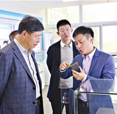 何大平(右)为刘忠范介绍石墨烯相关产品。