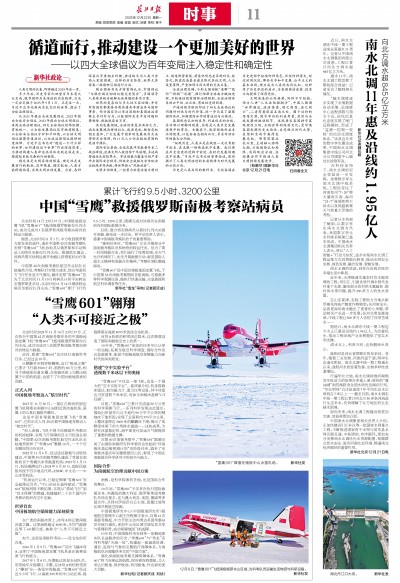 北京时间2025年11月14日23时37分,正在执行中国第42次南极考察任务的中国极地固定翼飞机“雪鹰601”飞抵南极俄罗斯新拉扎列夫站,成功完成对1名俄罗斯南极考察站病员的转运与救援。