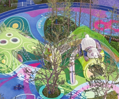 从空中俯视,可以清楚地看到,这个集休闲、运动、游乐于一体的熊猫主题乐园,通过红蓝绿紫四种色彩,自然划分成“狮城花园”“云鲸背上”“山峰穿越”“竹林里”等四块不同功能的主题活动区域。四大功能区涵盖了花朵秋千、敲击鼓、鲸鱼跷跷板、帆船摇马、漩涡弹跳、熊掌梅花桩、摇晃桥、竹林游戏踏等21项覆盖全年龄层的游乐项目。