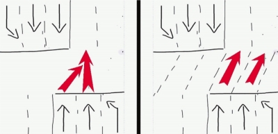 宋先生留言时附的路口交通优化示意图:左为原路口车流示意图,右为加分道指引线后的路口车流示意图。