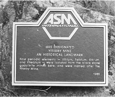 伊特比矿场入口处铭牌,上写:“国际材料信息学会指定伊特比矿为历史地标,从这里开采的黑色石中,曾经分离出钇、铽、铒、镱等四种新元素,并以伊特比命名。”