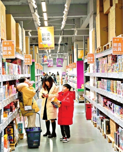 “轻语有品”潮玩超市试营业首日,顾客在挑选潮玩商品。