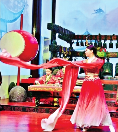 舞台之上,身着楚式襦裙的乐师们端坐于编钟旁,抬手、敲击,动作行云流水。古朴厚重的编钟发出清亮悠远的乐声,搭配古琴的婉转悠扬,瞬间将现场氛围拉满。舞台中央,一位舞者身着红白渐变长裙,水袖翩跹,舞步轻盈,时而旋转跳跃,时而舒展腰肢,每一个动作都与古乐节奏完美契合,仿佛是从楚国画卷中走出来的仙子。背景大屏上,楚地山水、宗庙宫阙的画面缓缓切换,与乐声、舞姿相映成趣,让人仿佛穿越回了两千多年前的楚国。