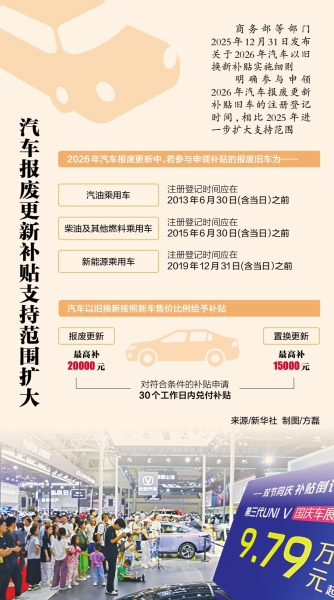 《2026年汽车以旧换新补贴实施细则》明确,参与申领2026年汽车报废更新补贴旧车的注册登记时间,相比2025年进一步扩大支持范围。