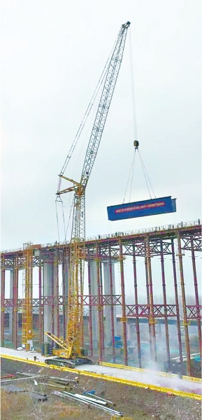 汉南长江大桥北岸滩地引桥钢梁正在架设。
