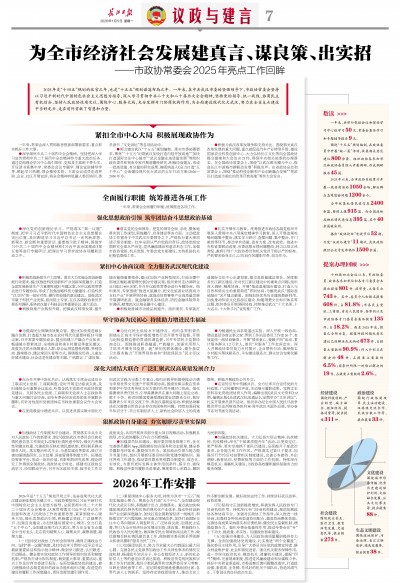 ●倾力建言武汉“十五五”规划编制。落实市委部署要求,聚焦“‘十五五’时期武汉加快打造内陆开放高地”“加快打造国际交往中心城市”“武汉金融业高质量发展”等组织政协委员和智库专家开展前瞻性研究,积极协商建言,形成一批高质量、有分量的研究成果,被吸纳进入《全力打造“五个中心” 全面建设现代化大武汉的五年行动方案(2026—2030年)》。