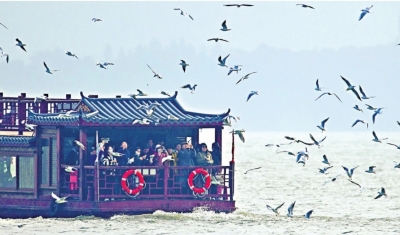 红嘴鸥伴飞东湖游船。