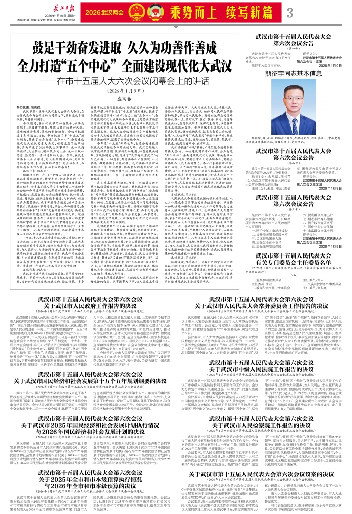 武汉市第十五届人民代表大会第六次会议 关于武汉市2025年国民经济和社会发展计划执行情况 与2026年国民经济和社会发展计划的决议