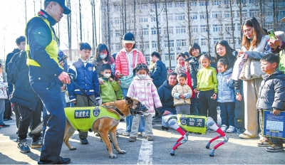 1月10日,市公安局举办警营开放日活动,机器狗与警犬吸引市民。