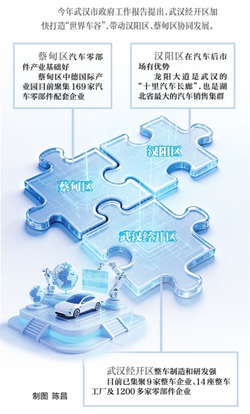 为何是这三地协同?长江日报记者围绕这个问题问了问三地相关部门,简单概括就是,三地的产业有互补性——武汉经开区整车制造和研发强,蔡甸的汽车零部件产业基础好,而汉阳在汽车后市场有优势。