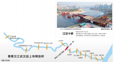江汉十桥是《武汉市城市总体规划(2017—2035)》中规划建设的21座跨汉江桥梁之一,也是武汉汉江上第11座公路桥梁。项目西起黄金口大道什湖路,东至古田一路长云路口,由跨汉江主桥、两岸引桥及接线组成,线路全长约4123米。
