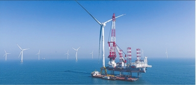 20兆瓦海上风电机组地处台湾海峡南口,约58层楼高。该机组并网发电后,单台年发电量可满足4.4万户家庭1年的用电需求。图为1月13日,全球首台20兆瓦海上风电机组吊装现场。