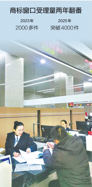 “这几年,商标申请量几乎是‘翻着跟头’往上涨。”窗口工作人员方元元指着电脑屏幕上的数据告诉记者,2023年,窗口年受理量2000多件;到了2025年,已突破4000件;而今年元旦后到22日,已受理商标申请192件,“平均每个工作日超10件,高峰时还会排起小队”。
