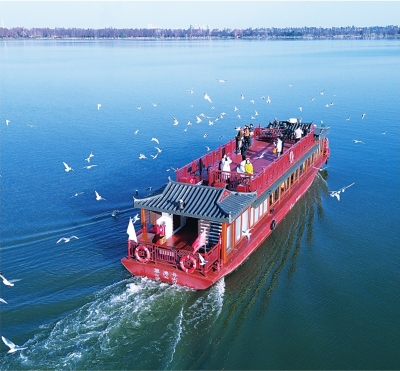 乘东湖游艇观红嘴鸥成游客热捧项目。